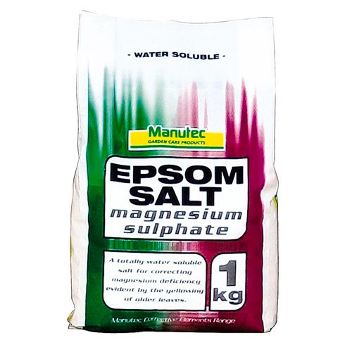 Epsom salt (Magnesium Sulphate) A highly soluble and economical form of magnesium source to correct magnesium deficiency (shown as yellowing of old leaves) in plants particularly in acidic soils.